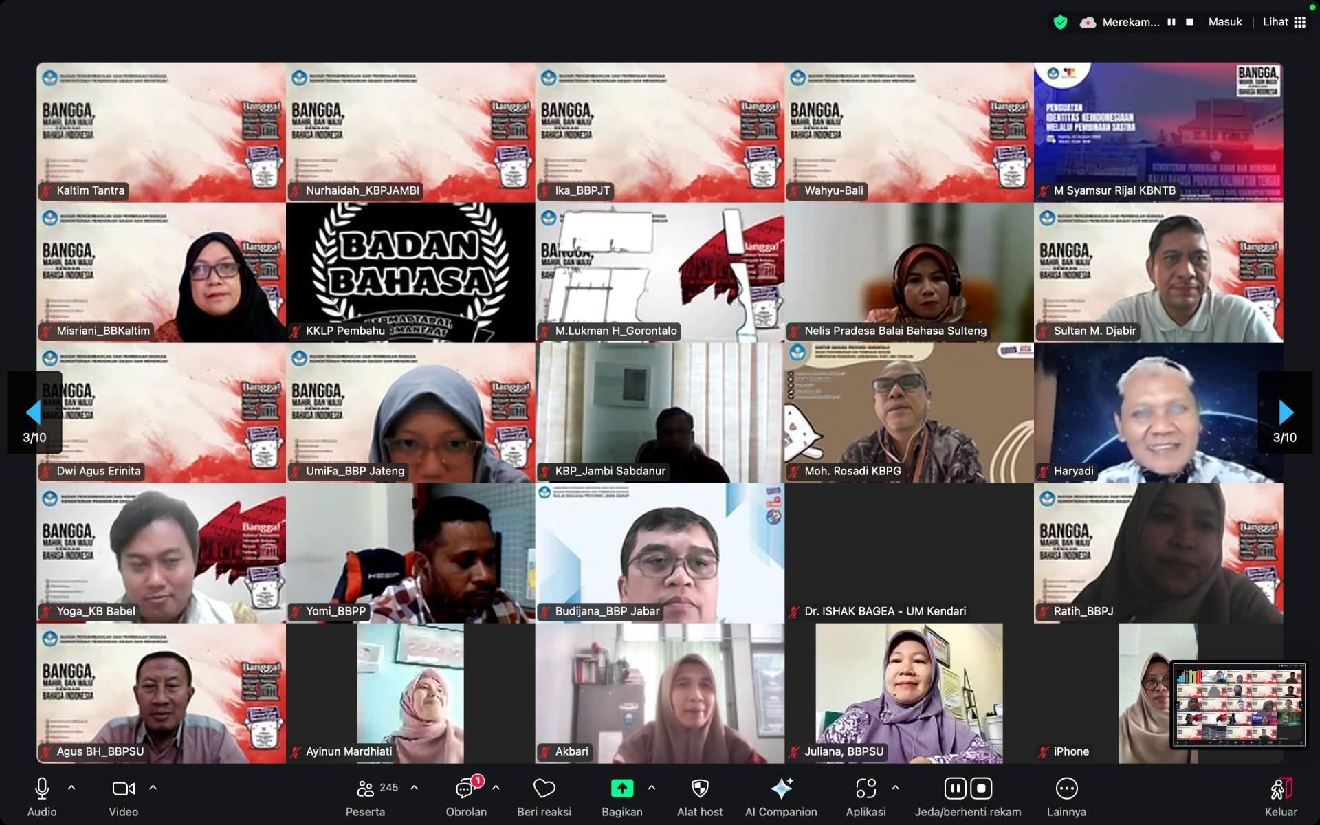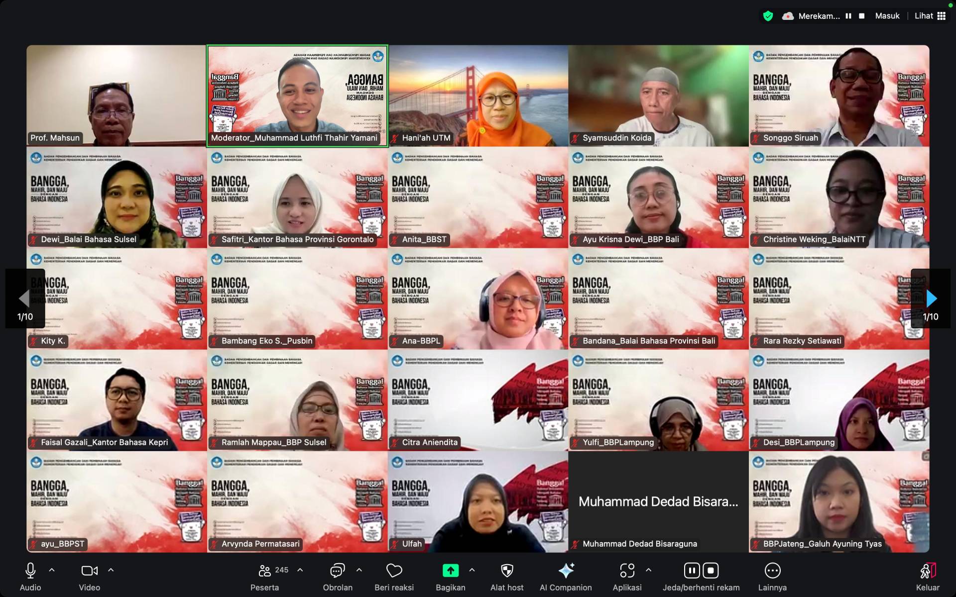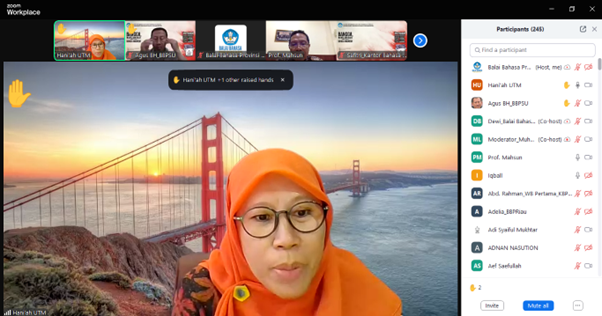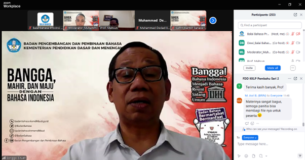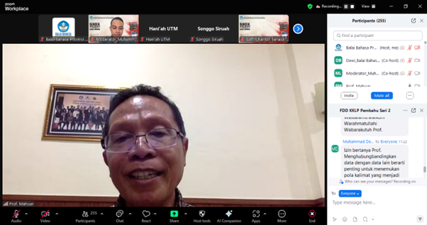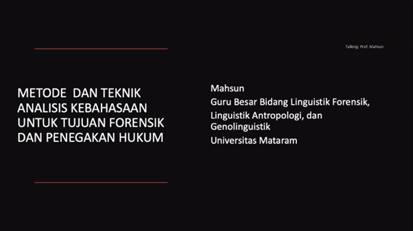 Dalam pemaparan materinya, Prof. Mahsun menjelaskan tentang konsep dasar linguistik forensik serta metode dan penerapannya dalam penyediaan data hingga analisis teks. Kegiatan tersebut dihadiri oleh 254 peserta dari berbagai kalangan, seperti mahasiswa, dosen, peneliti, serta kelompok kepakaran dan layanan profesional kantor/balai bahasa di seluruh Indonesia.