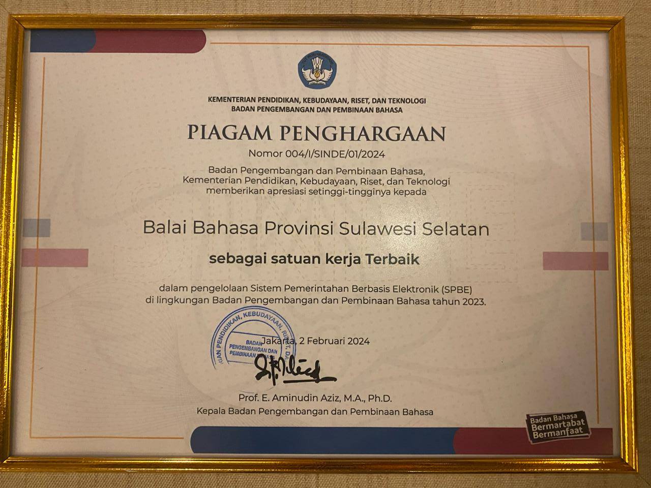 - satuan kerja Terbaik dalam pengelolaan Sistem Pemerintahan Berbasis Elektronik (SPBE) di lingkungan Badan Pengembangan dan Pembinaan Bahasa tahun 2023;