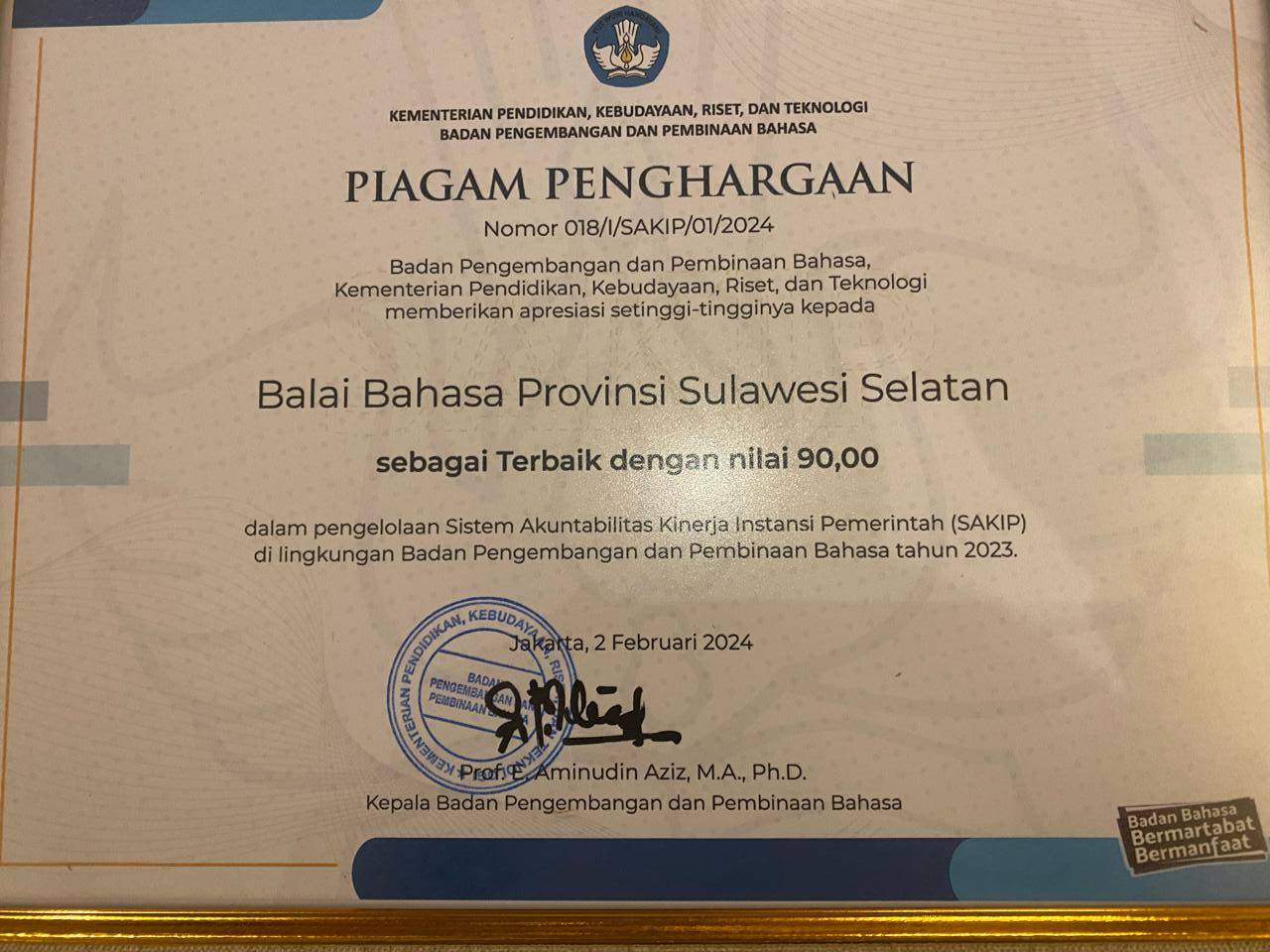 - Terbaik dalam pengelolaan SAKIP di lingkungan Badan Pengembangan dan Pembinaan Bahasa tahun 2023 dengan nilai 90,00.