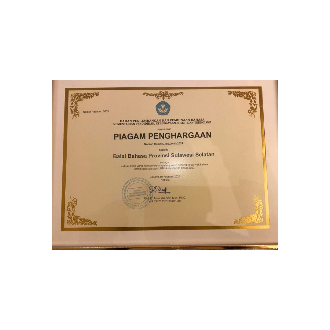 - capaian jumlah peserta terbanyak kelima dalam pelaksanaan UKBI Adaptif pada tahun 2023;