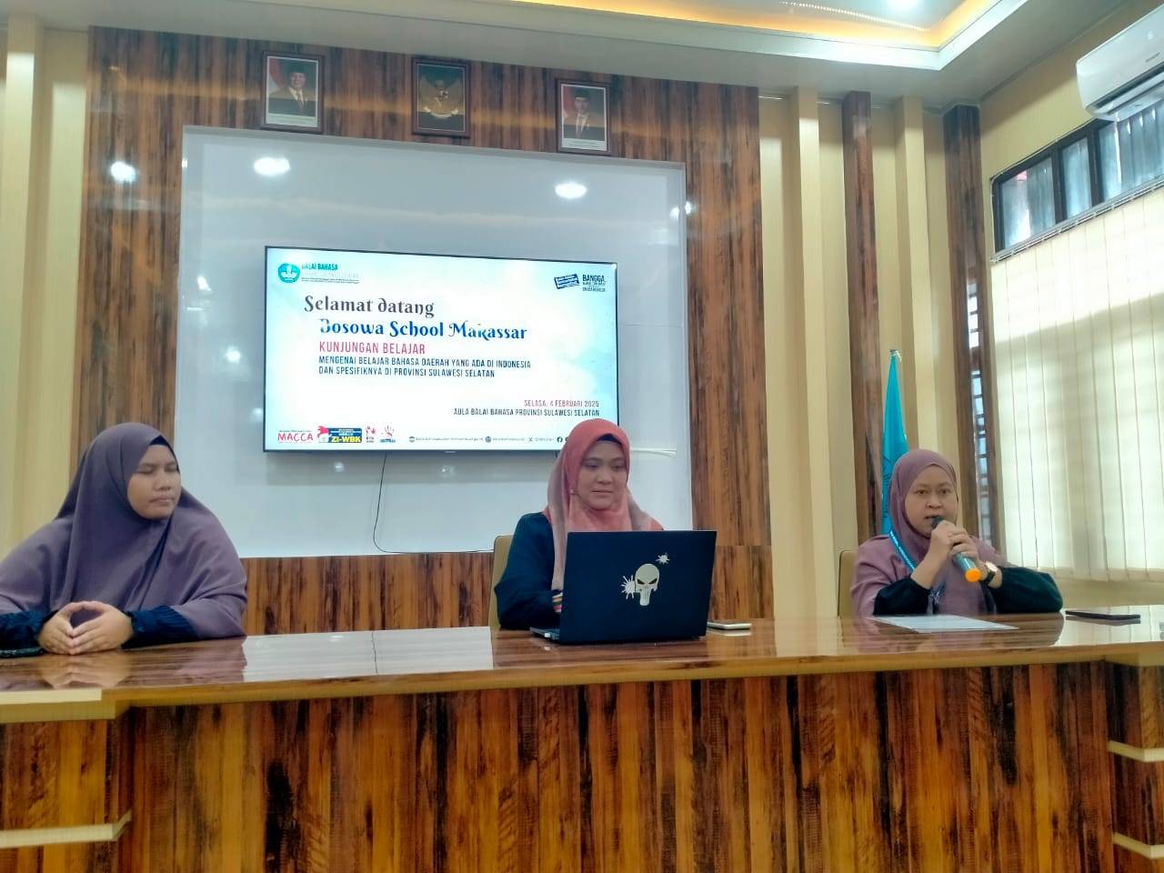 Kegiatan tersebut didahului dengan sepatah kata dari perwakilan guru Bosowa School, Sarah Nurul Latifah. Selanjutnya sambutan penerimaan oleh Plt. Kepala BBP Sulsel, Dewi Pridayanti. Kemudian dilanjutkan dengan pemaparan terkait Peta Bahasa Daerah di Provinsi Sulselbar oleh Koordinator KKLP Molinbastra, Amriani. Materi berikutnya mengenai produk penerjemahan cerita anak berbahasa daerah oleh Rahmatiah, Koordinator KKLP Penerjemahan. Materi ketiga adalah dari Koordinator KKLP Kamus dan Istilah, Charmilasari, mengenai Kamus Digital Bahasa Makassar dan Bahasa Bugis.