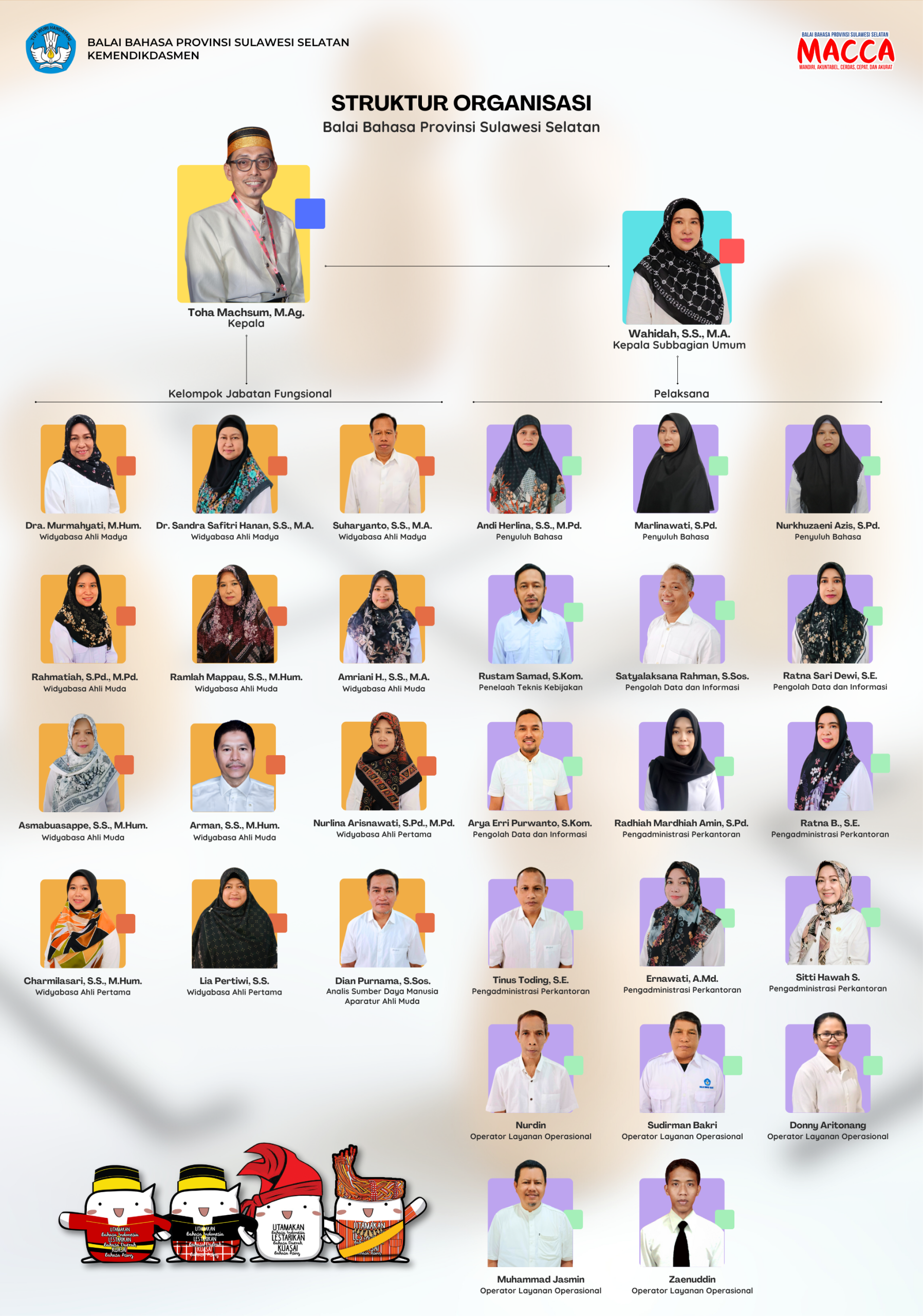 Balai Bahasa Provinsi Sulawesi Selatan merupakan satuan kerja/Unit Pelaksana Teknis pada Badan Pengembangan dan Pembinaan merupakan satuan kerja/Unit Pelaksana Teknis pada Badan Pengembangan dan Pembinaan Bahasa. Balai Bahasa Provinsi Sulawesi Selatan dipimpin oleh Toha Machsum, M.Ag.